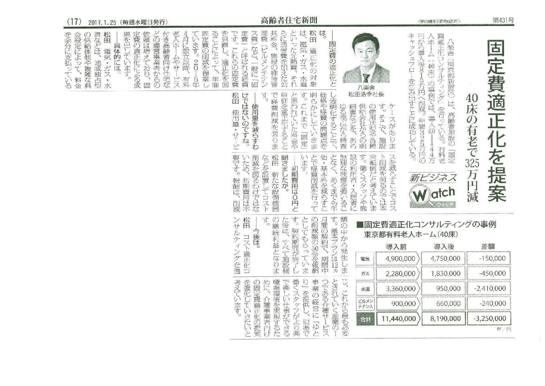 『高齢者住宅新聞』に八楽舎が紹介されました。1月25日発行『高齢者住宅新聞』に八楽舎の「固定費適正化コンサルティング事業」が紹介されました。事業者の皆様にとって、「コスト削減」は安定的な運営を図り利用者の皆様に末永く利用して頂くためにも永遠のテーマでもあります。 使用量やサービスを減らすことでコストを削減する手法はあまりにも安易な手法であり、ストレスのかかるコスト削減は結果として「利用者負担」「従業員負担」「業者負担」という具合に誰も幸せになることはありません。 弊社が提案する固定費適正化コンサルティングは「コストの削減」ではなく「コストの適正化」と称し、これまでに培ったノウハウを基に適正な料金単価を導き出しプラン変更によって確実にキャッシュフローを生み出します。 新聞の記事には適正化の事例も分かり易い表で掲載されていますので、これを機に興味を持って頂ける事業者様が増えるのではと考えています。 これからも介護事業者様のお力になれる日を楽しみにしています。